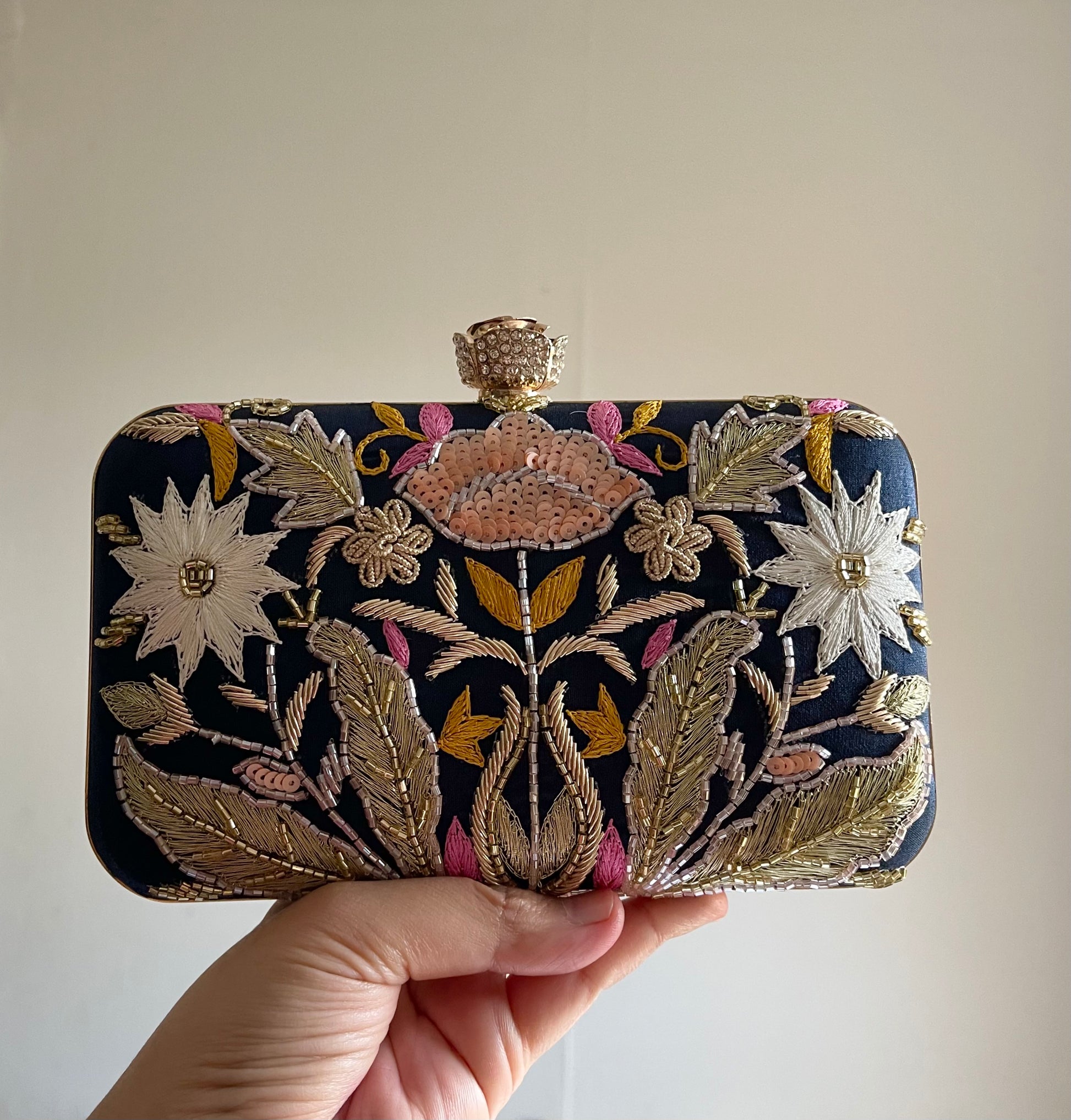 Exuding elegance, this clutch bag is crafted from luxurious Blue silk and adorned with intricate gold dabka zardozi embroidery. Delicate pearls, shimmering cut dana, and sparkling sequins add opulence, while a charming rose button closure completes the look. Perfect for adding a touch of floral glamour to any ensemble, this accessory is a timeless statement piece.